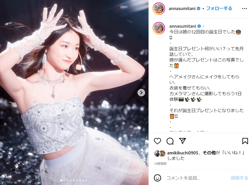 住谷さんは、「誕生日プレゼント何がいい? って先月話していて、娘が選んだプレゼントはこの写真でした ヘアメイクさんにメイクをしてもらい、衣装を着せてもらい、カメラマンさんに撮影してもらう1日体験 それが誕生日プレゼントになりました」と写真を紹介。